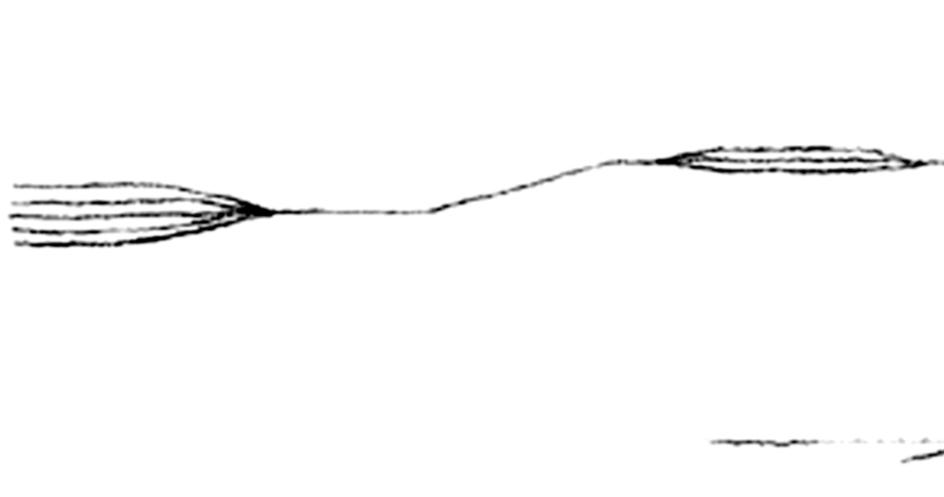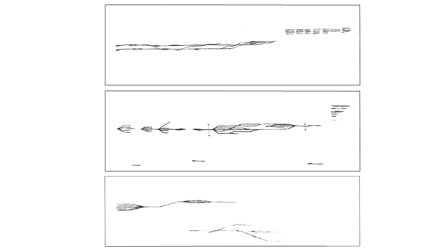 From this drawing, here is what we can expect in the music: 5 distinct pitches and equidistant/evenly spaced, sustained for a while, joining together at the same speed to one single pitch, holding that unison for a while, before moving as one single voice upwards, sustaining that pitch for a while, and then separating into 4 different voices: 3 upper ones (pitches close to each together) and one lower voice way bellow.