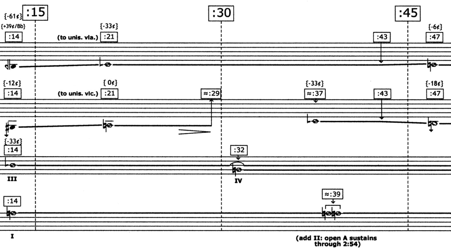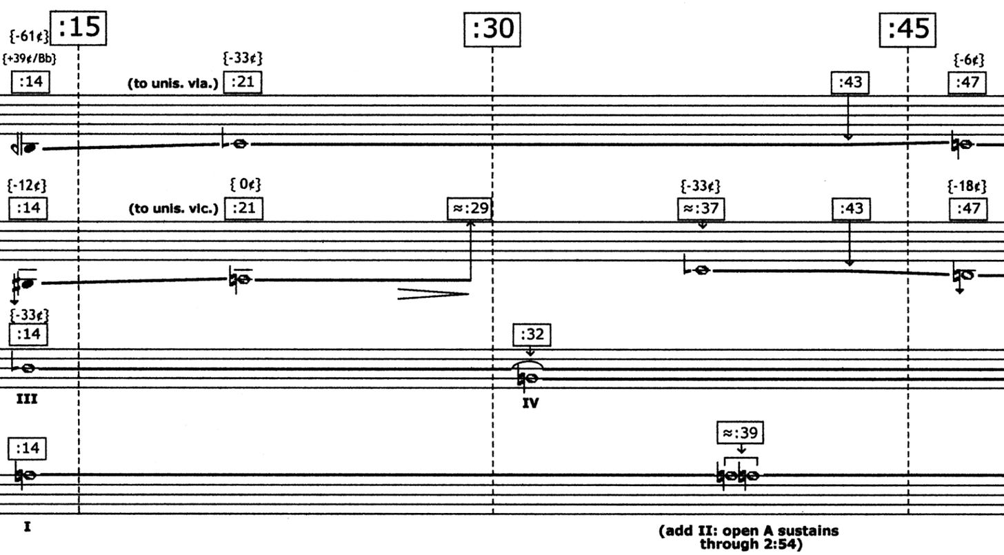 vln1 : 13:D (B-61c) → 14:D (C-33c) (// vla) → 1:C (-6c) vln2 : 15:A (G# -12c) → 1:A (0c) ( // vlc) → (silence) → 14:D (C-33c) vla : 14:D (C-33c) [ → 14:D ] → 1:A vlc : 1:A [ → 1:A ] [ → 1:A doubled ]